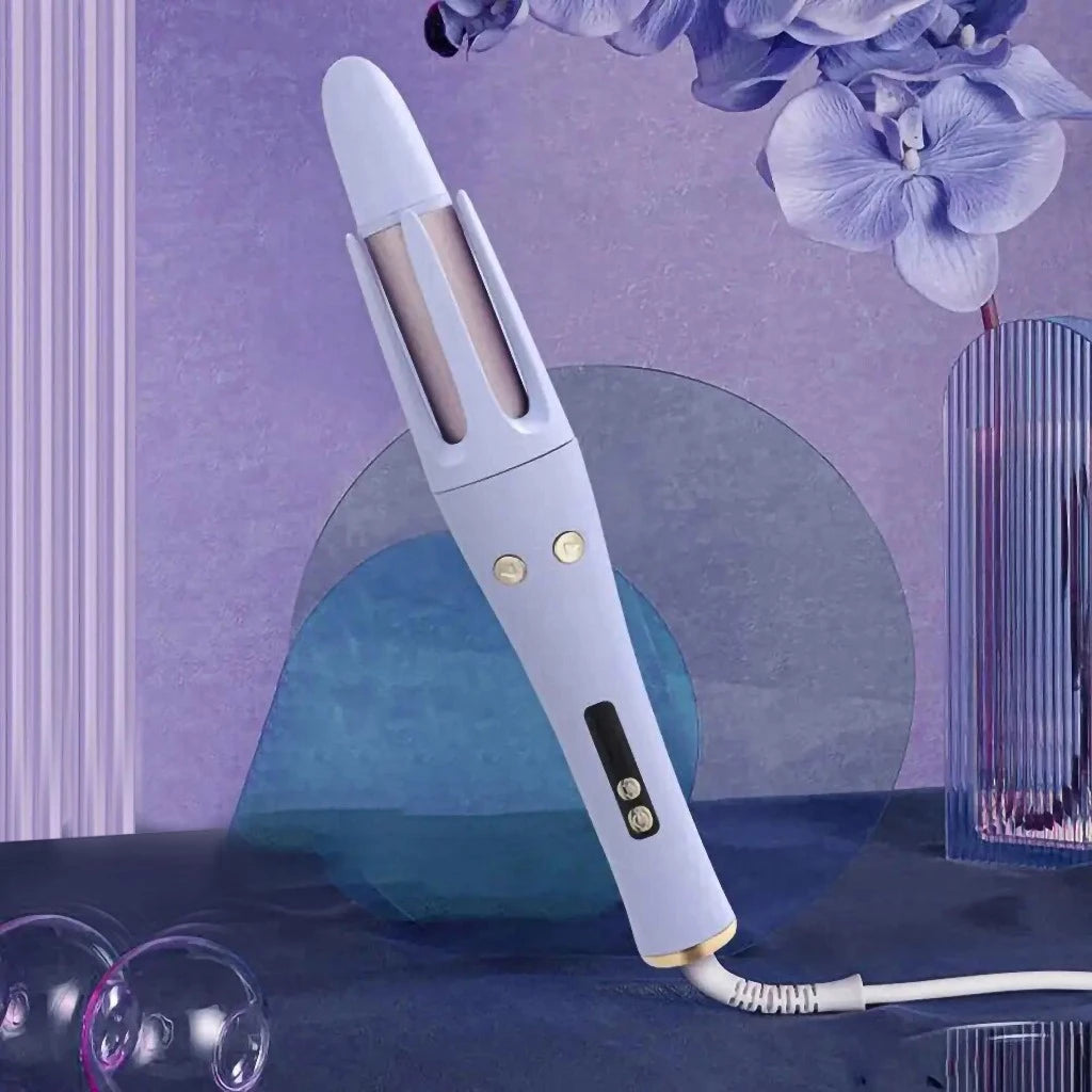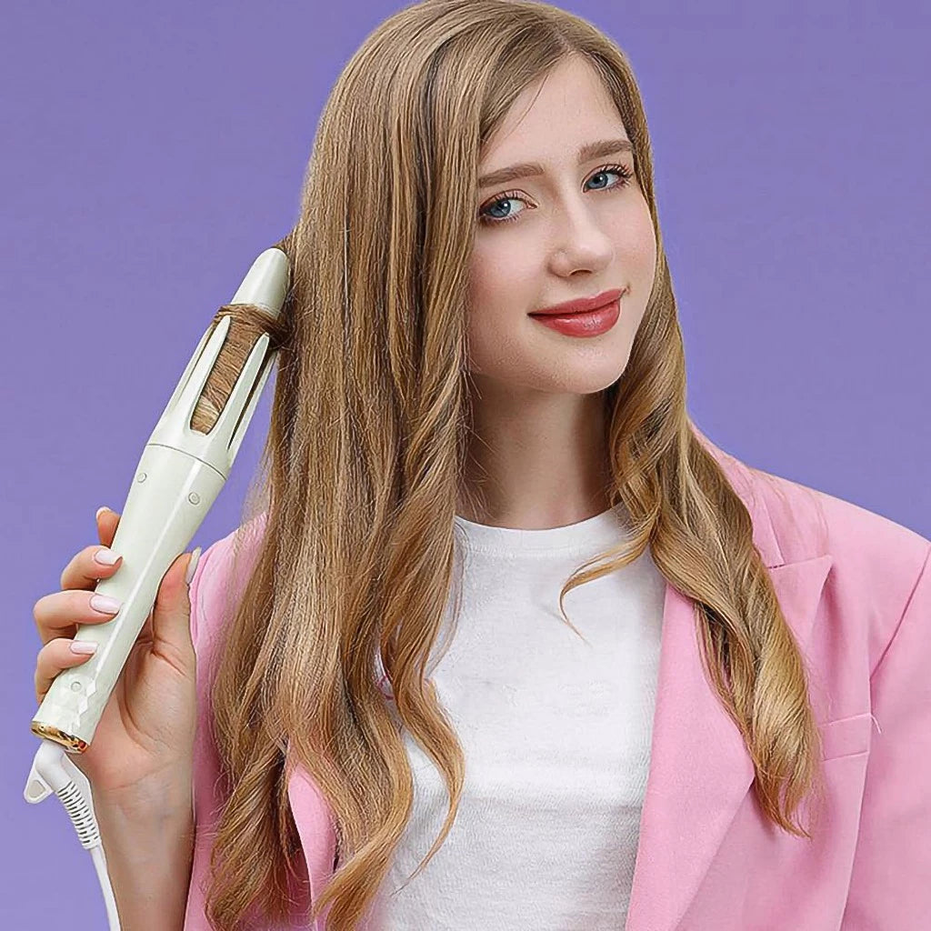 Modelador automático de cachos com rotação 360°, desenvolvido para facilitar a criação de ondas e cachos de forma prática. Pode ser utilizado em diferentes tipos e comprimentos de cabelo como parte da rotina de modelagem.